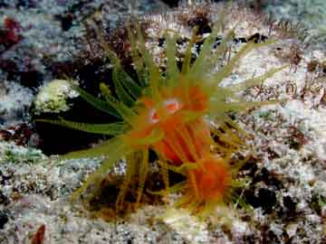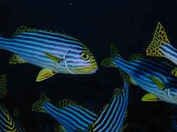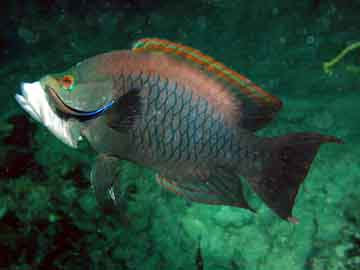 The sling-jaw wrasse extends its mouth to be cleaned by the blue-streak cleaner wrasse. The mouth is used as a suction tube when hunting food. |