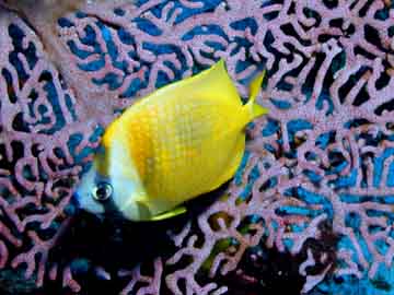 While clearly yellow with a blue snout, this is called a brown butterflyfish. In the background is a purple Gorgonian sea fan. |