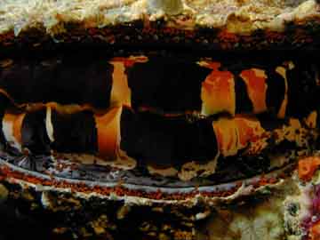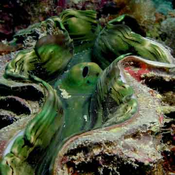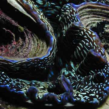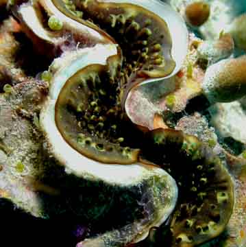 Below are the mantles of several giant clams. The clams themselves had shells from one to two feet long. I don't know if the different colors indicate different species, or are just individual variations, but the patterns were always subtle, intricate and beautiful. |