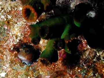 A Little Combtooth Blenny sticks his head out of his hole in the reef. |
