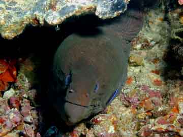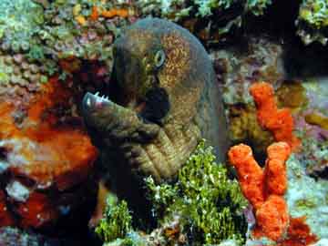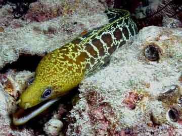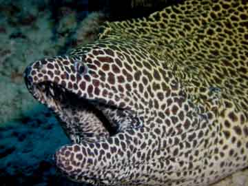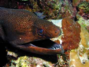 Moray eels are common in all tropical waters, and the Maldives are no exception. One of the most beautiful (except for those who say yechh to all eels) is the Honeycomb Moray at left. On the right is an Undulate Moray, which prowls Maldivian reefs at night, looking for Kleenex. Below are three shots of the very common Black Cheek Moray. |