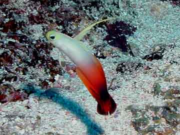 Red fire gobies are generally found in pairs, but this one's mate has already ducked into a hole in the sand. |