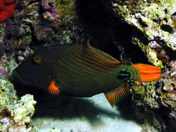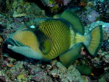 The Titan Triggerfish is the largest species of triggerfish in the world. This three-foot giant was excavating the reef by carrying pieces of coral weighing a couple of pounds. |